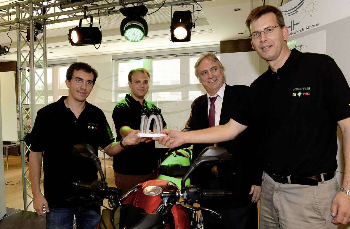 從左至右:來自布爾的馬丁查姆布倫(MartinChambrion)和詹斯蘭格齊(JensLanganki)憑借關(guān)于摩托車新離合器的創(chuàng)意獲得了今年的靈感大獎。舍弗勒集團(tuán)副首席執(zhí)行官兼首席技術(shù)官彼得古茲默教授和離合器壓盤產(chǎn)品開發(fā)總監(jiān)克里斯托弗惠特曼為其頒獎。